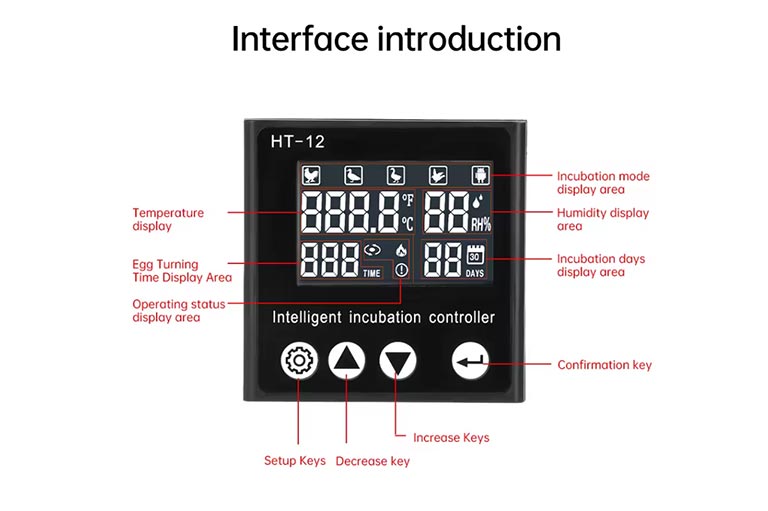 5. 5-kanalna nezavisna kontrola, precizna regulacija: Snažan kontrolni sistem pruža 5-kanalne nezavisne izlaze za kontrolu kontrole temperature, okretanja jaja, zaštite od previsoke temperature, kontrole vlažnosti i funkcije alarma, ostvarujući fino upravljanje različitim indeksima u proces inkubacije.
