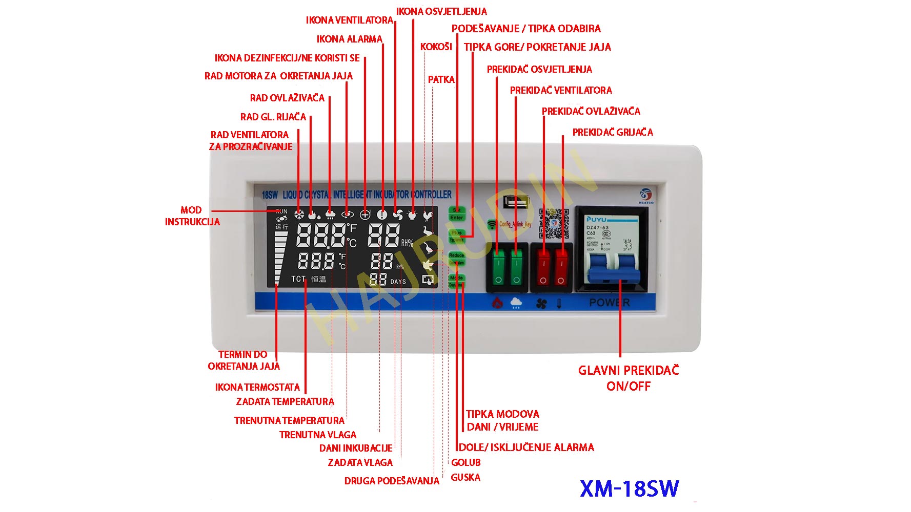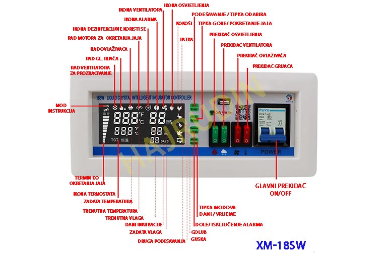 Ovo je nova generacija inteligentnog regulatora za inkubator koji kontroliše pored temperature i vlažnosti i sve ostale parametre koji su nam bitni prilikom procesa inkubacije. XM 18SW je potpuno inteligentni mikroračunarski kontrolni sistem dizajniran i razvijen za inkubacionu industriju i primjenjuje najnoviju mikroelektronsku tehnologiju i komponente novog tipa.