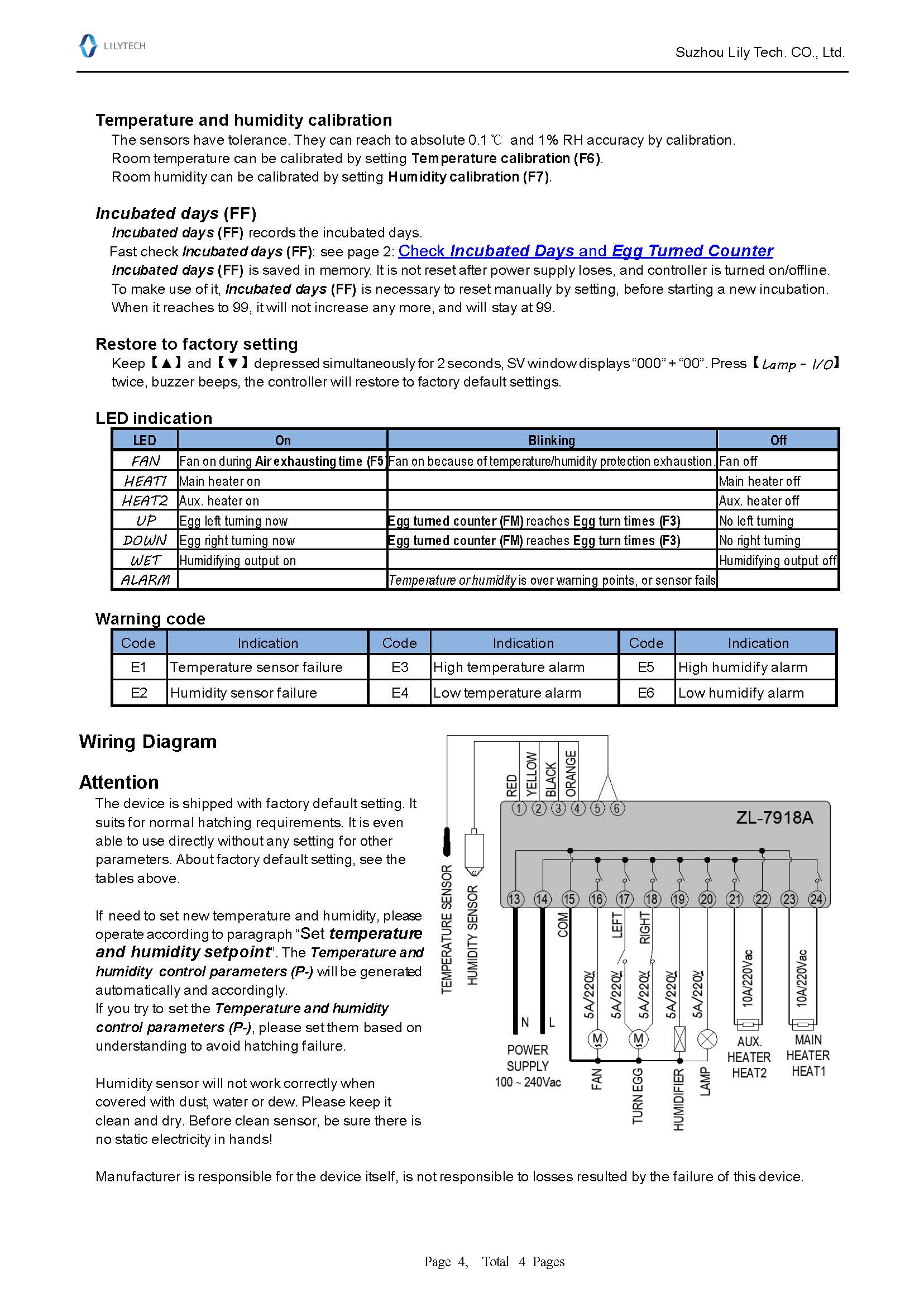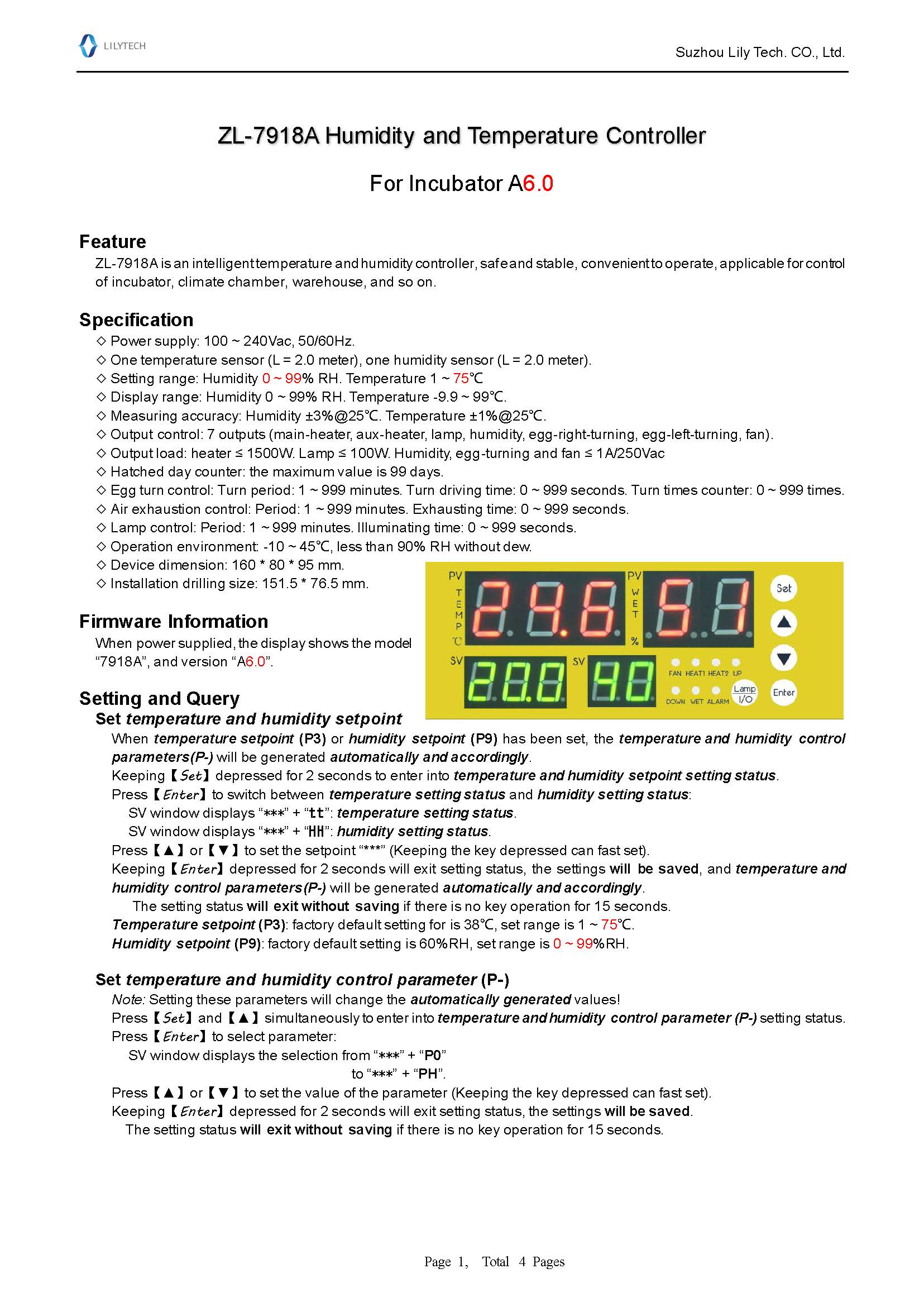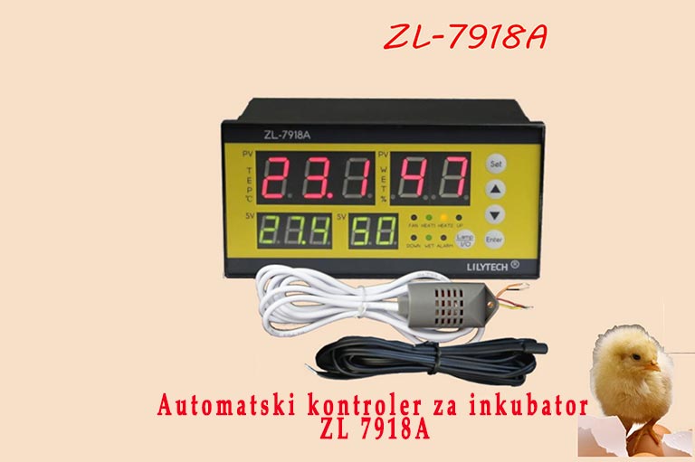 ZL-7918A Regulator vlažnosti i temperature za inkubator A6.0 Sa samostalnim hlađenjem, odvlaživanjem, kontrolom izlaza ventilatora za ventilaciju, kontrolom okretnog motora i A/C i 12/24VDC i opcionom detekcijom i kontrolom prekidača vrata, ZL-7918A inkubatorski kontroler zadovoljava mnoge zahtjeva tržišta. Primjenjiv je za klimatske komore, skladišta, sušare tj svuda gdje je potrebno kontrolisati temperaturu i vlažnost a prvenstveno za inkubatore jer ima dodatne kontrole specijalno prilagođene toj funkciji.