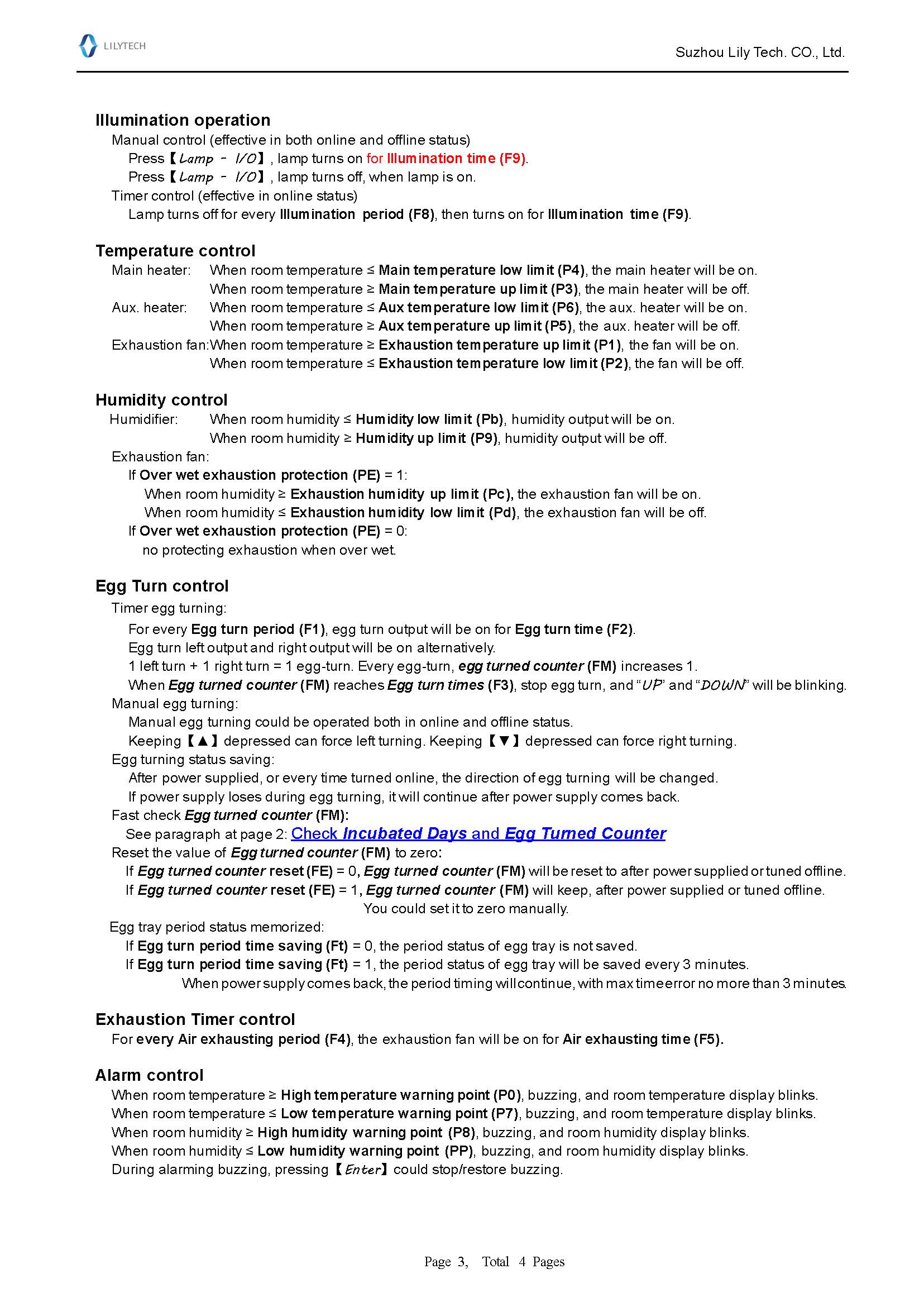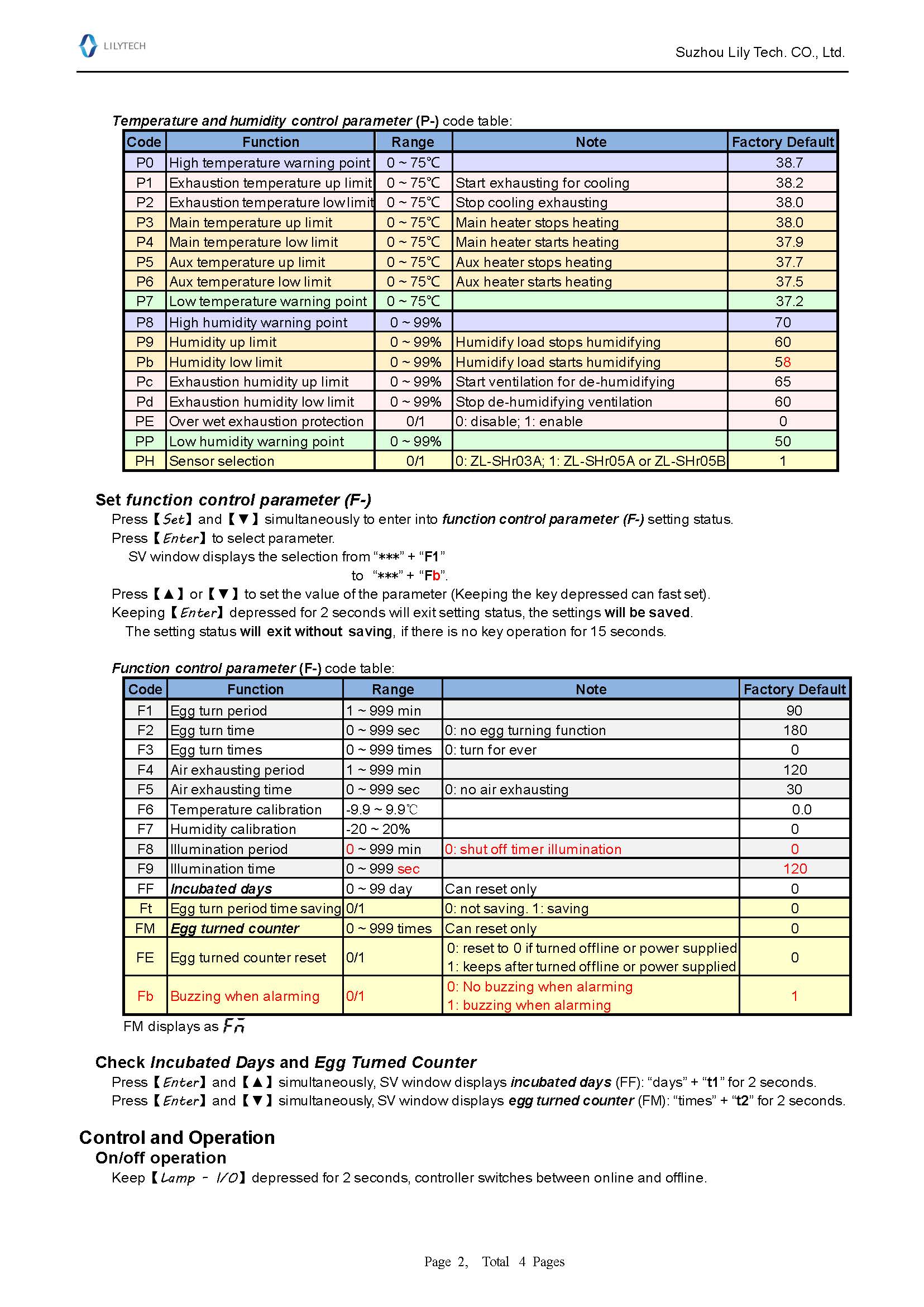 Normalni radni opseg temperature (37.3°C-38.3°C) je niži od 37.°C, viši od 38.6°C, alarm, a temperatura okoline ne prelazi 30°C. U principu, temperatura okoline je najmanje 10°C niža od podešene temperature. Normalan radni opseg vlažnosti (50%-70%), niži od 40%, veći od 75%, alarm, vlažnost radnog okruženja ne prelazi 70%, visoka i niska vlažnost u kratkom vremenu neće uticati na izleganje